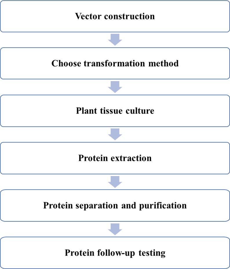 The research and industrial planting of genetically modified plants have developed rapidly around the world, and breakthroughs have also been made in the production of various foreign proteins by the expression of genetically modified plants. By constructing exogenous protein genes on plant expression vectors, using Agrobacterium or gene gun transformation methods, the target gene can be transformed into plant cells and integrated into the nuclear genome to obtain stable expression of transgenic plants. Synthetic recombinant protein can be stored in leaves, seeds, fruits, tubers and other parts. It can be separated and purified by separation means, or can be used directly by humans as edible vaccines or enzymes, avoiding complex and expensive downstream processing and storage costs of products. The specific experimental process are as follows:
